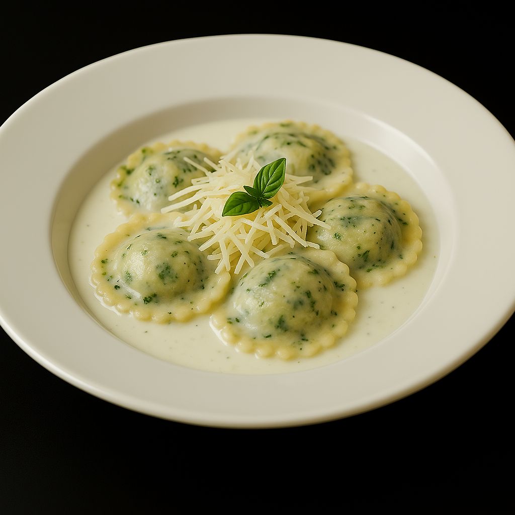 Ravioli con albahaca y salsa blanca. Elige el relleno.